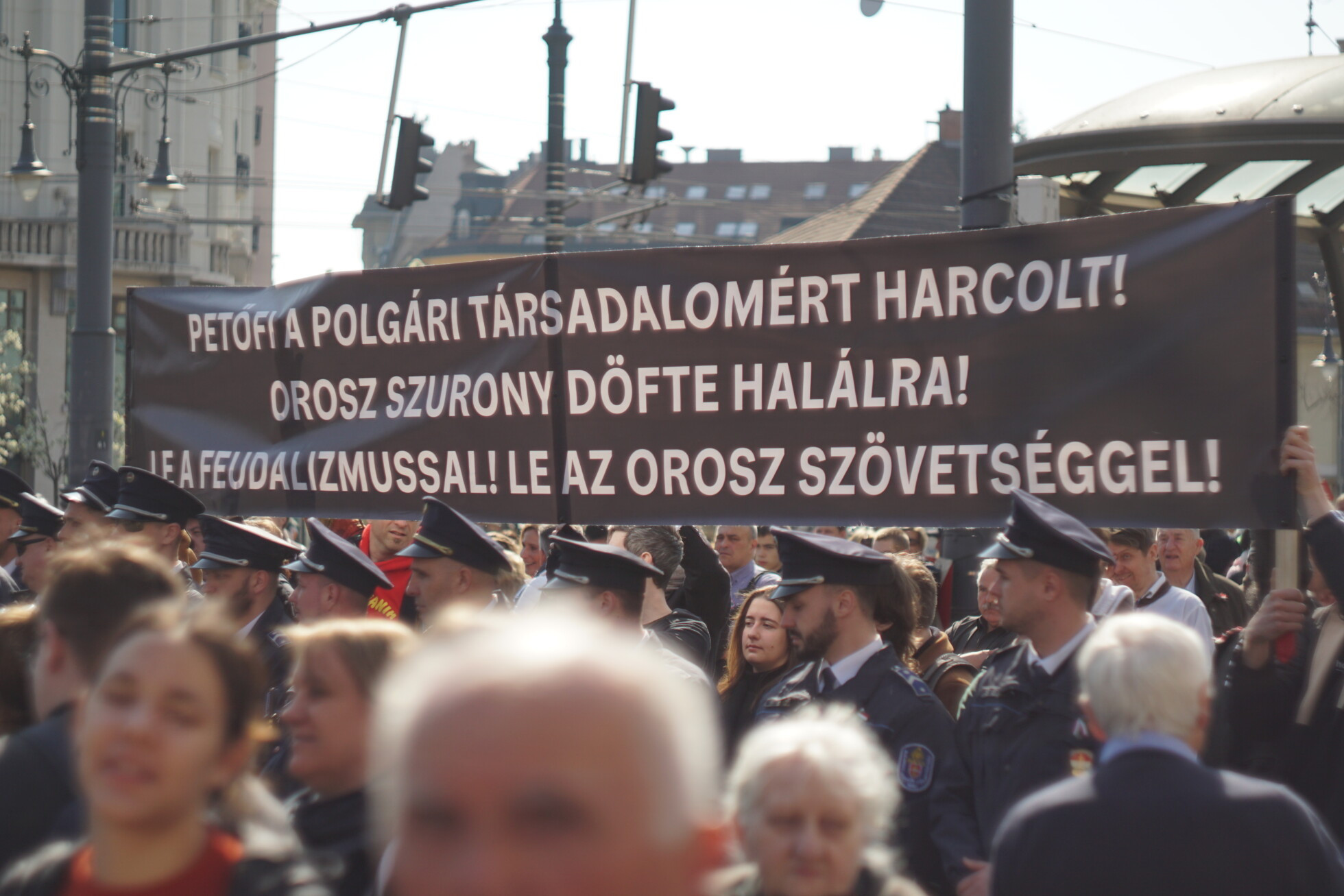 Még nem kezdődött el Orbán beszéde, amikor néhány fiatal egy molinót tartva benyomult a kordonon kívüli tömegbe. A molinóra az volt írva, hogy „Petőfi a polgári társadalomért harcolt! Orosz szurony döfte halálra! Le a feudalizmussal! Le az orosz szövetséggel!”. Néhányan felháborodva megpróbálták lerángatni a molinót, le is köpték.