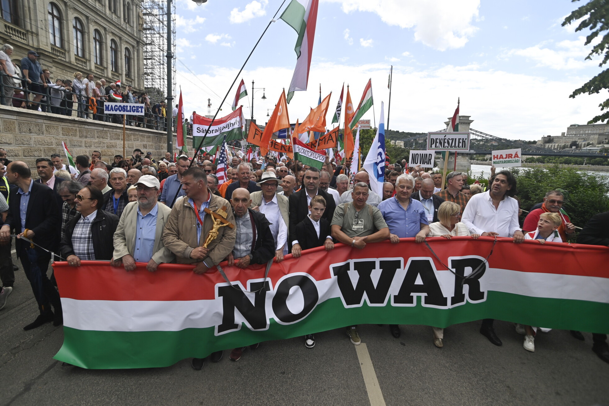 A Békemenet a Lánchídtól indult a Margit-szigetre. A szokásos koreográfiának megfelelően a Fideszhez kötődő közéleti személyiségek vittek a menet elején egy molinót az aktuális üzenettel. Ez most a piros-fehér-zöld alapra írt „NO WAR” volt, a molinót többek között Deutsch Tamás, a Fidesz listavezetője, Semjén Zsolt miniszterelnök-helyettes, Bayer Zsolt fideszes publicista-megmondóember, Bencsik András és Bencsik Gábor fideszes újságírók, Pataky Attila énekes és Fásy Ádám médiaszemélyiség-vállalkozó vitték. Mögöttük valóban óriási volt a tömeg. A Békemenetre az egész országból érkeztek Fidesz-szimpatizánsok.